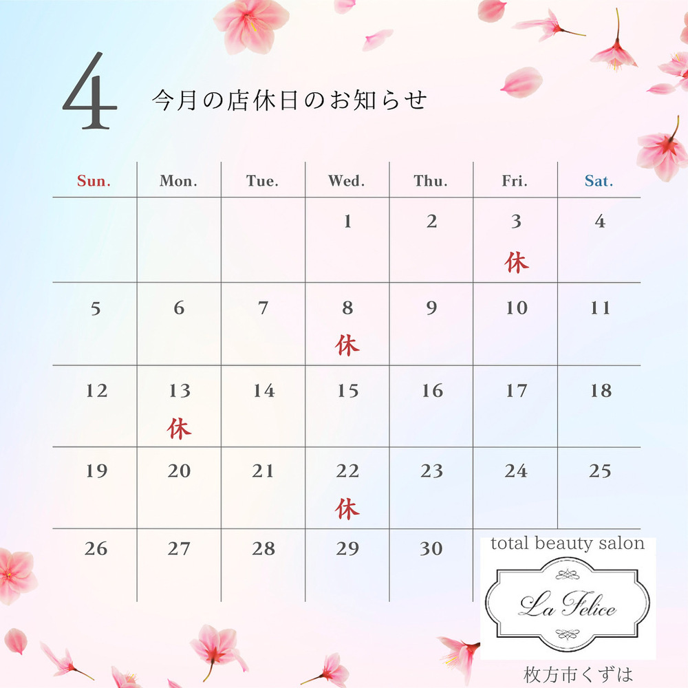 4月の店休日のお知らせです【LaFelice】